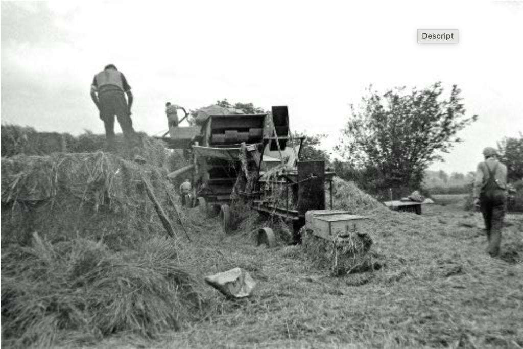 Haymaking time was a busy but enjoyable time of year, any available hands were brought in to help and endless jugs of tea were carried to the rickyard. The first job was to go round the sides of the field with a bagging hook to clear all rough grass and rubbish away, anyone who could wield a scythe helped as well. Mr. Higgs from Rose Hall Farm came with his men and machinery, all the implements were horse drawn. Firstly, cutting with a mechanical scythe and after laying for a given period, it was turned. This often by men with hayforks which only have two tines, unlike a garden fork. After being raked into rows ready for the sweep to come along and pull it into heaps ready to be taken to the rickyard on the cart. This cart had four wheels and extensions on all sides that looked like a five barred gate. Children loved to come to the field hoping for a ride back to the yard. Great fun bumping over the field on top of the hay. Often when horses and machinery were busy on other farms, we had to wait and pray it would not rain until the rick was built, this was done by men tossing fork loads of hay up to the man on top who built the rick ready for the thatcher to finish off with straw preserving it for winter use.