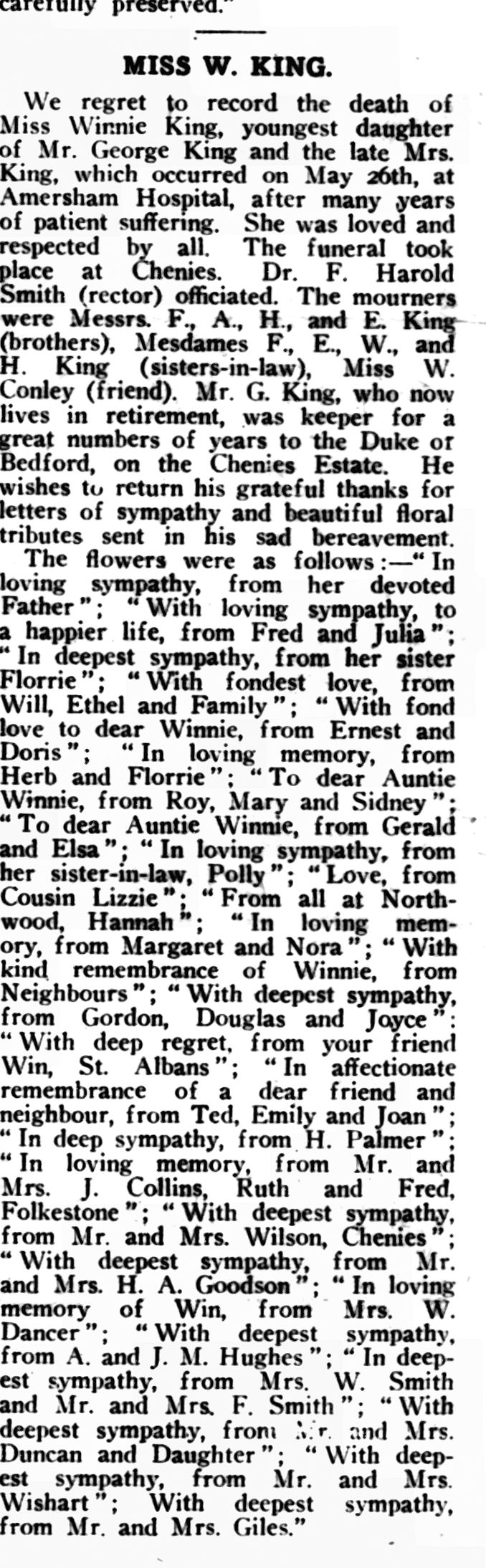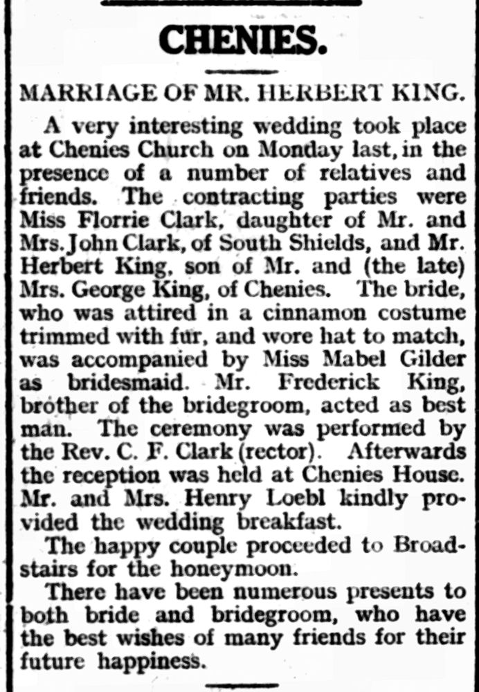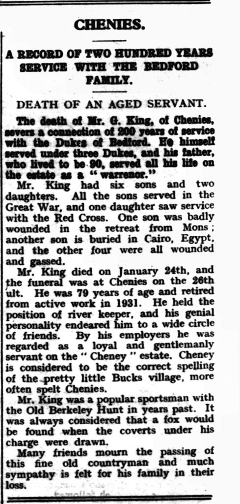 “The death of Mr. G. King, of Chenies, severs a connection of 200 years of service with the Dukes of Bedford. He himself served under three Dukes, and his father, who lived to be.90, served all his life on the estate as a ” warrenor.” 3 February 1939