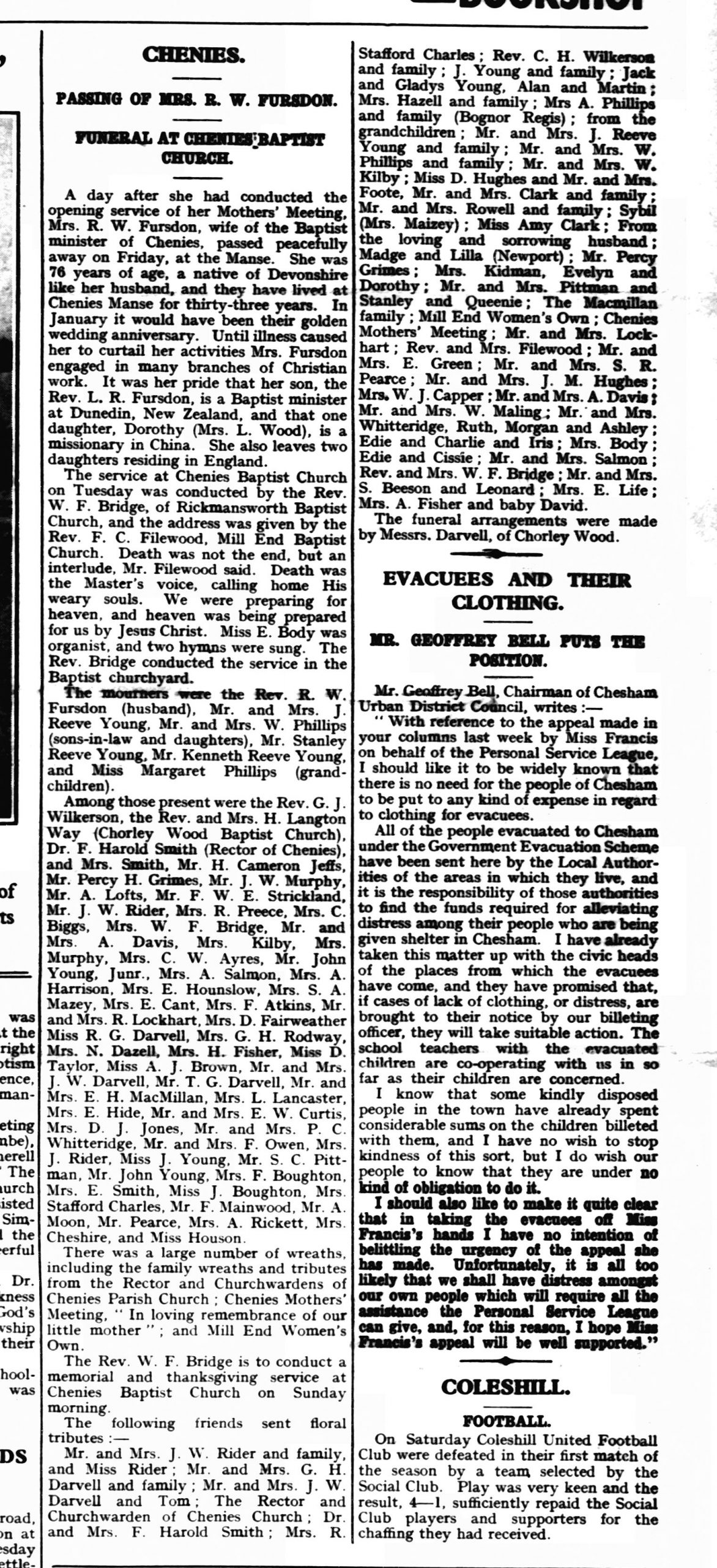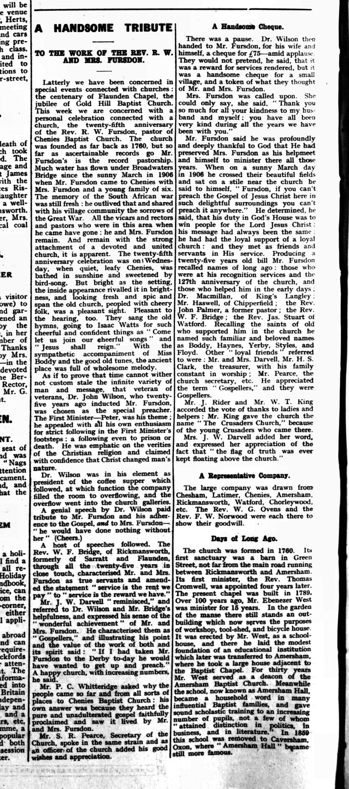 Grace Margaret Fursdon was married at Chenies in 1924, to a Wilfrid Phillips , and both appear in the 1939 census as living with their parents at the Manse. In 1931, Dorothy was also married to a Lawrence Wood. In the same year, the village celebrated the 25th anniversary of the Fursdon’s pastorate, the longest at Chenies thus far, with a special service followed by coffee and supper. Speeches were made, and the Fursdons declared as ‘true servants‘, and the church as ‘a happy church, with increasing numbers’ as a result of it’.