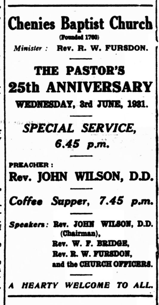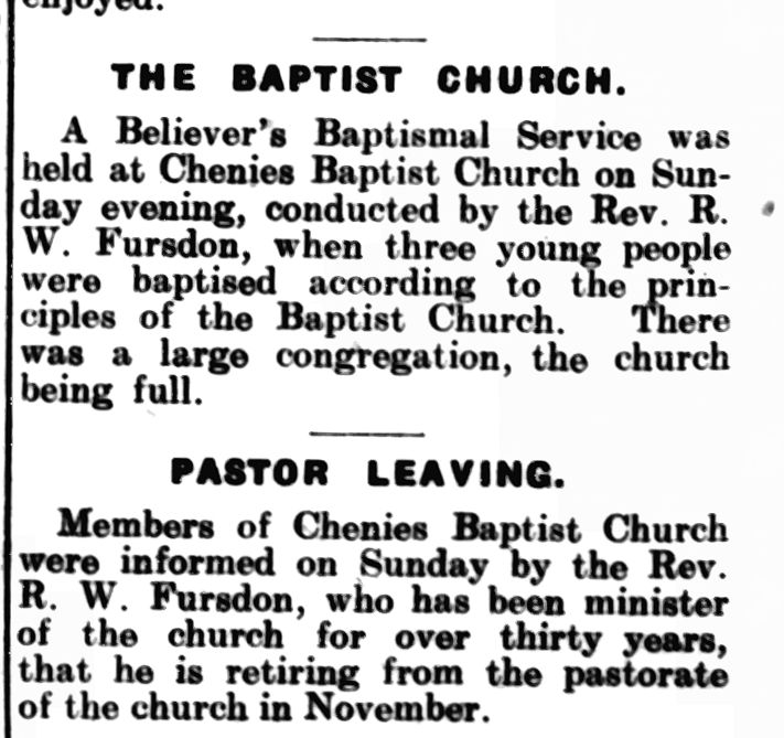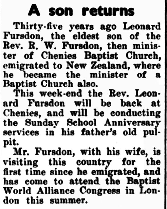 Robert died in New Zealand in 1951, but Chenies welcomed Leonard Fursdon once again in 1955 to lead the Sunday School Anniversary services in his father’s old pulpit. Visiting the UK for the first time since 1920, Leonard was attending the Baptist World Alliance Congress in London.
