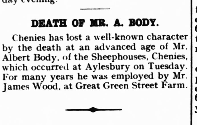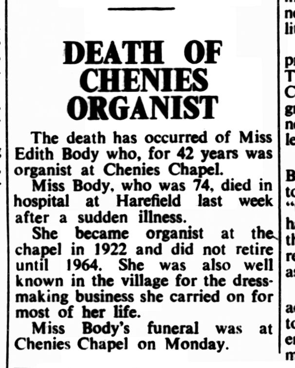 | Bastin, Joe, Bastin, Private Benjamin, Bastin, Hilda, Bastin, John, Bastin, Jane, Bedford, Duchess Adeline, Bedford, Dukes Beeson, Charles/Charley, Beeson, May Cecil, Beeson, Sam/Sammy, Biggs, John, Blakeaway, Tom, Blandford, Lady, Body, Albert, Body, Edith, Body, Private John, Body, Joseph, Body, Sarah, Boughton, Harry, Boughton, John Henry, Boughton, T.T, Brown, Adela, Brown, Alfred J, Brown, Lewis Archibald, Brown, Ernest, Brown, Sarah | – Farmed at Old House Farm – Died in 1917. Son of John and Jane Bastin – Sister of Rose Maling – Parents of Private Benjamin Bastin – Parents of Private Benjamin Bastin – Lived at Woodside House. Wrote a 22 July 1914 letter complaining about the Fire Service – Dukes of Chenies Manor. Ran the Estate until 1954. – Slaughtered the pigs – Daughter of Mr. & Mrs Charles Beeson, died in 1907 of illness, age 12 – Worked for the estate and served in the ARF – Worked for the estate – Manager at the Bedford Arms on Christmas Day 1972 when fire broke out – lived at Chenies house after Miss Russell – Lived at Sheepshouses, worked at Great Green Street Farm – Church Organist at the Baptist Chapel and dressmaker. (May have lived at the Manse?) – Died on 14th August 1918. Son of Joseph and Sarah Body, lived at 69 Sheep Houses, Chenies – Parents of Private John Body, lived at 69 Sheep Houses, Chenies – Parents of Private John Body, lived at 69 Sheep Houses, Chenies – Ran Mill Farm and Manor Farm – Farmer and miller, father of TT, responsible for a stretch of the A404 – Ran a local business, T. T. Boughton & Sons Ltd. Engineers. Rose Maling‘s father worked for him – Daughter of Thomas Dollimore, wife of Alfred Brown – Died in 1918. Son of Ernest and Sarah. Husband of Adela Dollimore. Lived at No. 54. – Died in 1915 and is buried in the Baptist Chapel churchyard. Son of Ernest and Sarah. Lived at No. 54. – Parent of Lewis Archibald and Alfred J. Brown. Lived at No. 54. – Parent of Lewis Archibald and Alfred J. Brown. Lived at No. 54. |
