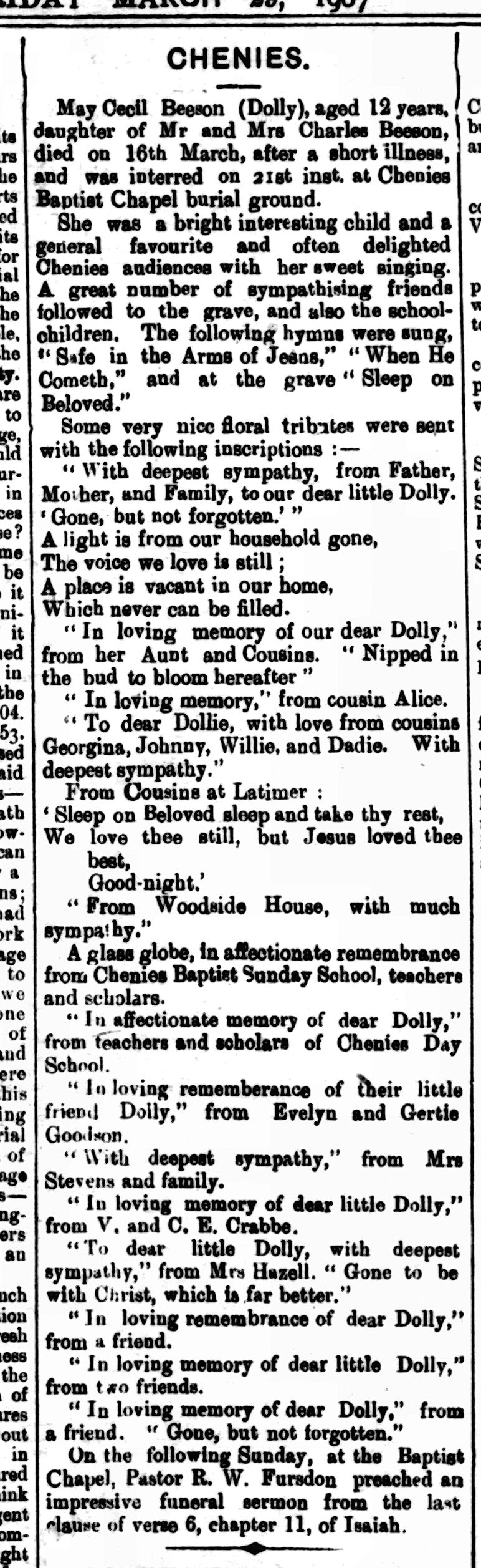 | Fitch Betty (née Young), Fitch Corporal Harry, Fitch, Mr. and Mrs. William, Fleet Jennifer, Fursdon, Rev. Robert W, Fursdon, Elizabeth, Fursdon Private John Stanley, | – Wife of Harry Fitch (married in 1940). Lived in Chenies – Died in 1944. Son of Mr & Mrs William Fitch, husband to Betty Young of Chenies. – Parents of Harry Fitch – Wrote memoirs of her time at Chenies School – Resident of the Manse, Minister of the Baptist Chapel for over 34 years. Parent of John Fursdon – Resident of the Manse, wife to Baptist Minister Robert. Parent of John Fursdon – Died in 1917. Som of Baptist Minister Rev. Fursdon and Elizabeth of the Manse |