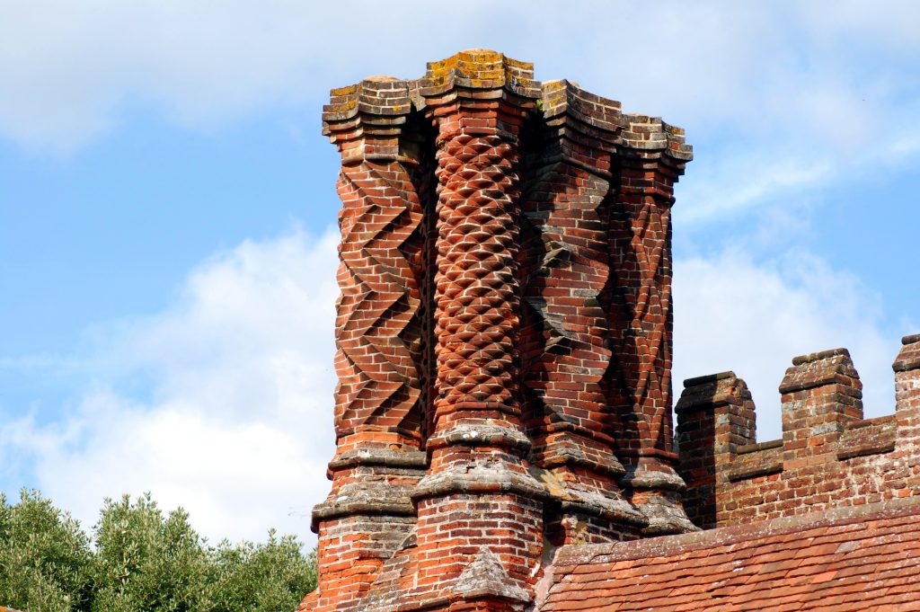 The bricks were dug from a nearby field (still known as “Claypits”) and are typical of that period, thin, and laid with blue diaper patterns at some points. Southwards, this building, which is a modified ‘shape’, with a battlemented tower in the angle, is joined by narrow galleries to the South wing, known as “new buildings”. These appear to have been added between 1523 and 1526 by the first Earl of Bedford, to improve the accommodation available for his guests. At this time the also, fireplaces were incorporated in the older buildings, as well as the additions, and nearly all the flues were furnished with ornamental chimneys, 22 of which survive. It is known that the workmen who rebuilt Chenies Manor also worked at Hampton Court, which Henry VIII was enlarging about the same time where the chimneys are very similar. Those at Chenies are among the best of their period.