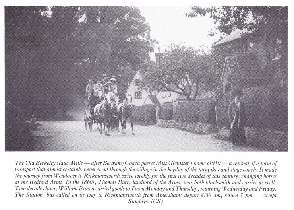 The Bedford Arms was used as the coaching inn from then on until after the first world war (previously this was the purview of the Red Lion). The Berkeley coach driven by four horses stopped at the Bedford on its way from Croxley and Rickmansworth to Amersham. The stables and coach house were in a single story building at the side of the inn. Here were kept horses which were used to pull the Broughams, Victorias and wagonnettes which were kept in the coach house. Sometimes a new horse was hitched to the Berkeley coach, but only if one of the team of four was lame or injured. A fire broke out at 10 am on Christmas Day 1972 and destroyed part of the upper storey. 25 staff and 10 guests owed their lives to the quick thinking and courage of manager Tom Blakeway, who was badly burned. Thirty firemen were needed to put out the blaze. The building was quickly restored, but evidence of the fire can be seen in the different tiles of the roof.