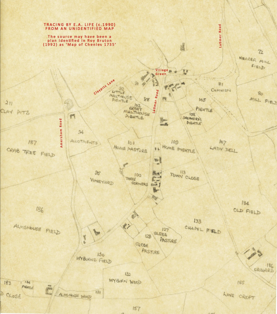 According to the dictionary (OED), a pightle is a Middle English term for a small field or enclosure. A very faded tracing made by Andrew Life from an unnamed map source (speculatively dated around 1735) identifies many of the old enclosure names in and around Chenies, and a number included Pightle in their title. For example, there was Little Malthouse Pightle, Great Malthouse Pightle, Home Pightle and Shepherd’s Pightle, all being clustered around the Village Green. As far as I’ve been able to tell, the land purchased by Ted Life (see Ted Life (1887 – 1971)) was on, or very close to, what was originally Little Malthouse Pightle, and this accounts for the unusual name chosen for his new house – The Pightle.