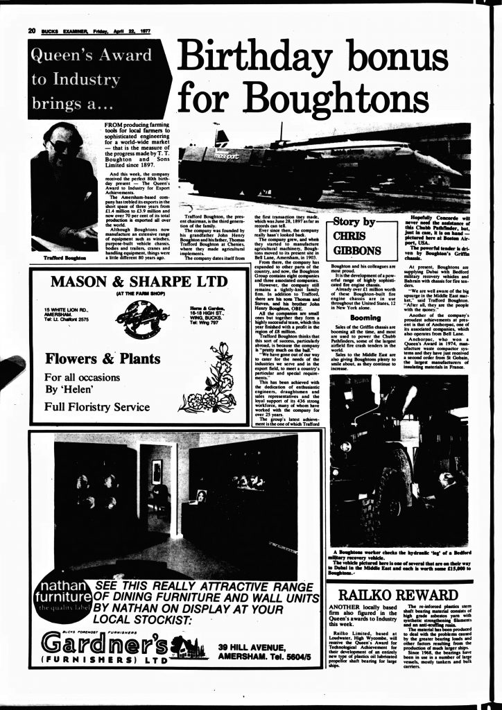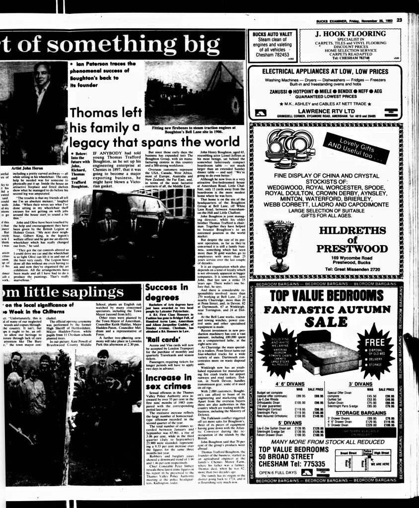 After a long and active life, Thomas died aged 85 in 1959, leaving his two sons to carry on the business, and one daughter. In 1977 the firm received the Queens award to Industury for Export achievements, and in 1989 they received a Fit for Work award for employing people with disabilities. “My father was a very compassionate man,” said (young) Mr John Boughton. “I remember one man used to cycle in from Chenies with one leg!“